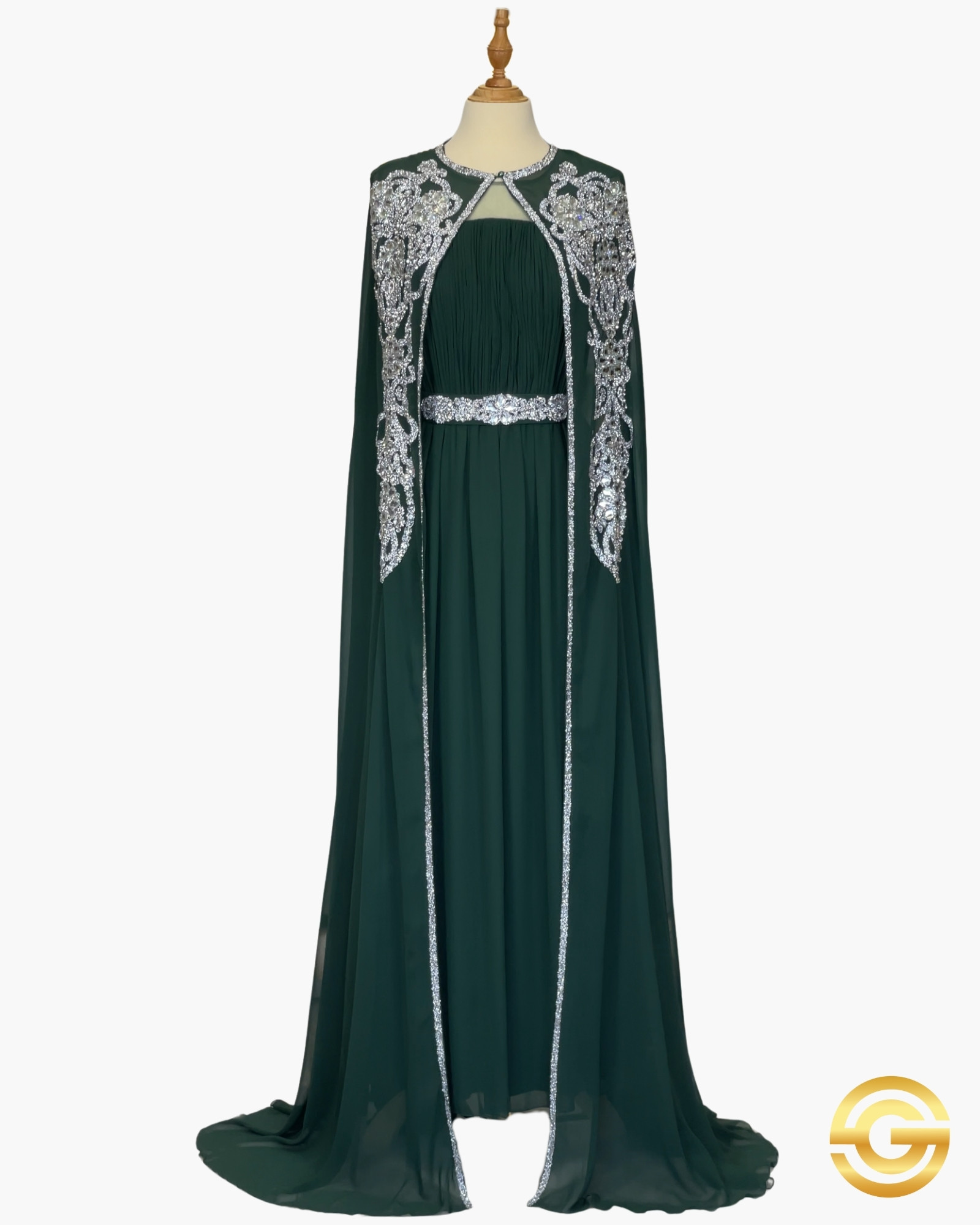It features two flowing pieces, with the upper one designed with side openings for the arms and delicately adorned with sparkling crystals and stones.