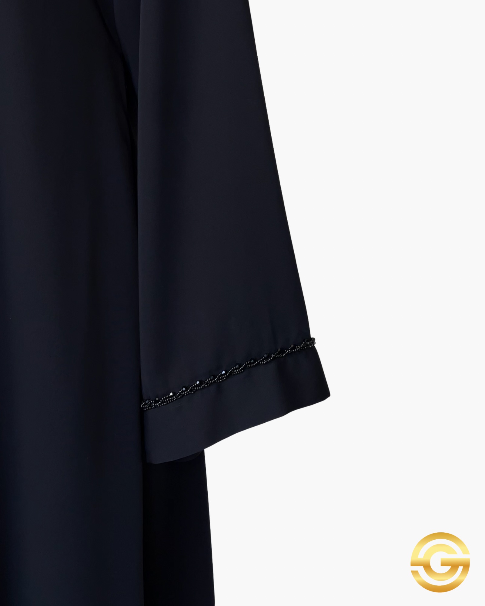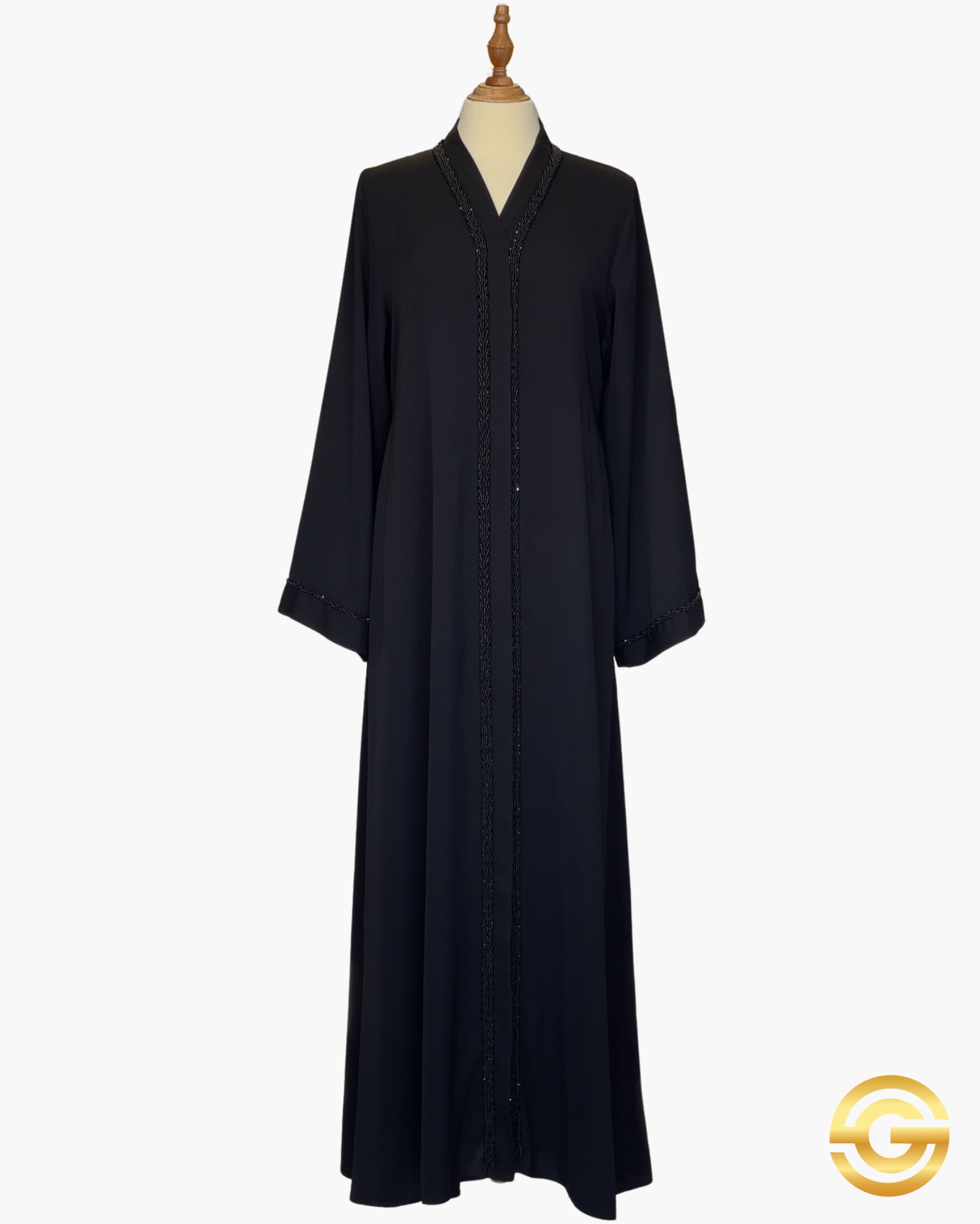 The abaya is adorned with sewn black stones arranged in a braided pattern, adding a subtle touch of elegance.