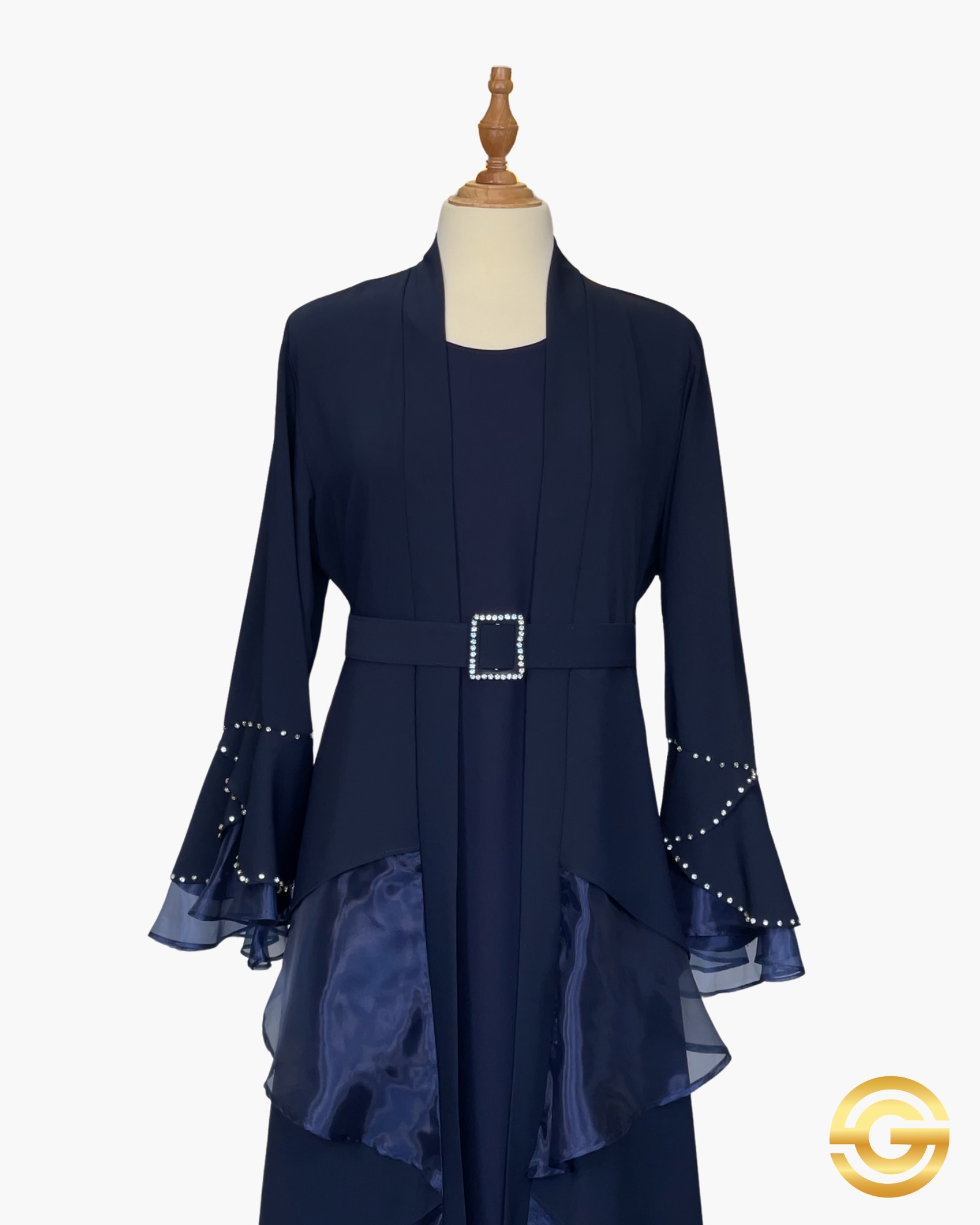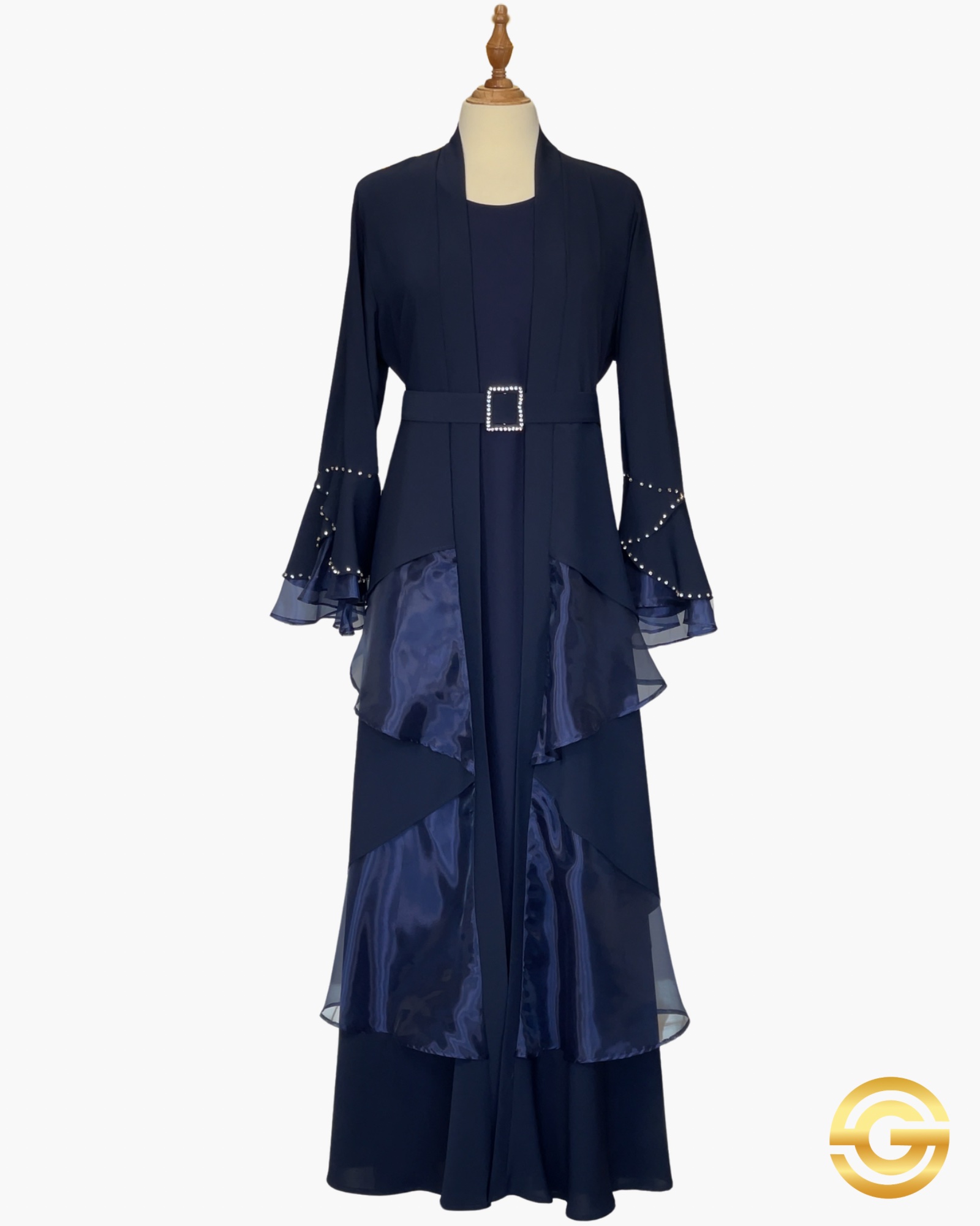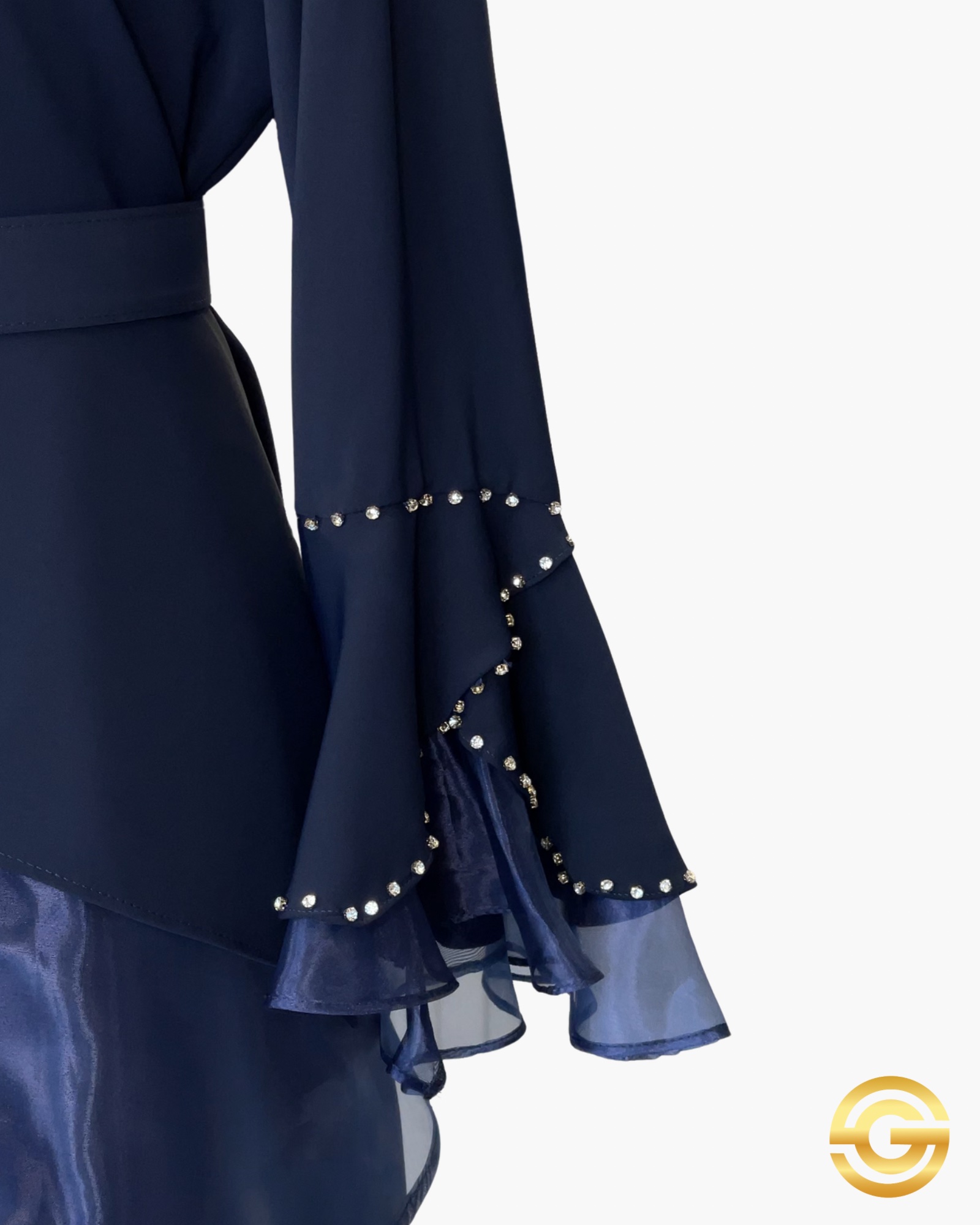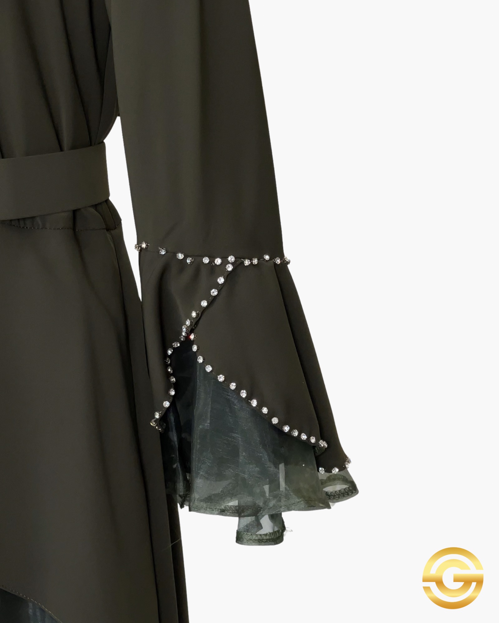 Ghadeer abaya is a two-piece set featuring an abaya elegantly embellished with sewn stones, paired with a dress made of crepe fabric.