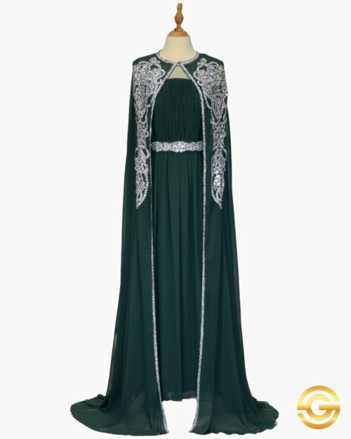 It features three-quarter sleeves and is beautifully adorned with a delicate strip of golden stones, adding a refined and luxurious touch.