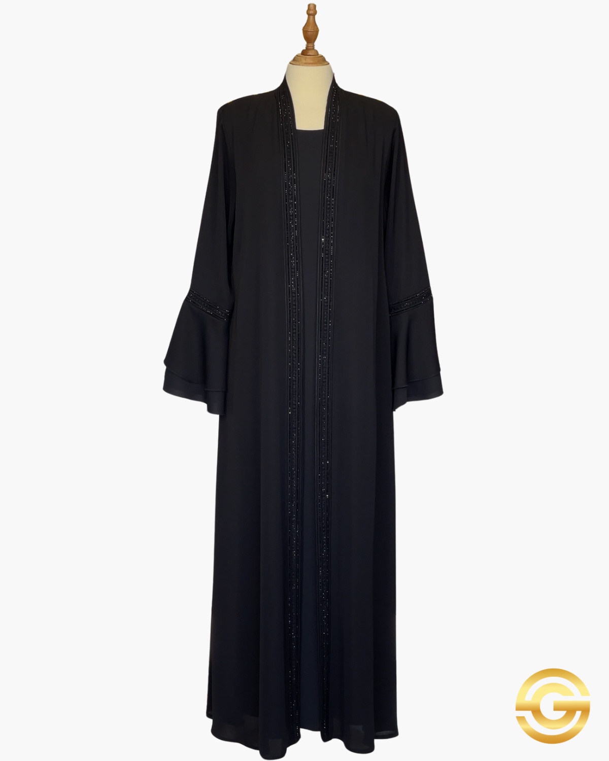 It is crafted from crepe fabric adorned with embroidery and rhinestones.